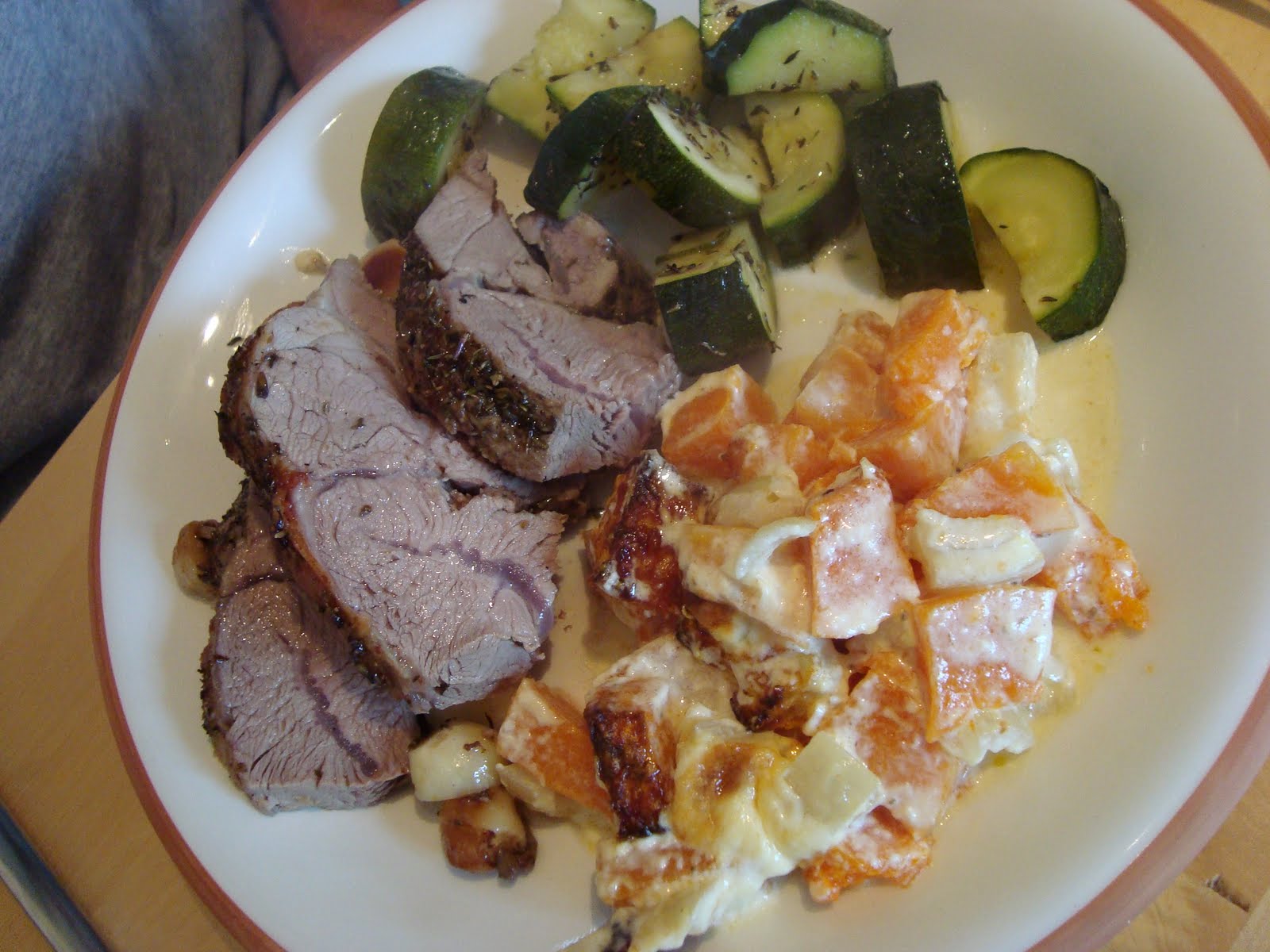 As such, a Sunday dinner of roast lamb, roasted courgettes with thyme, and a pumpkin gratin is definitely comforting.